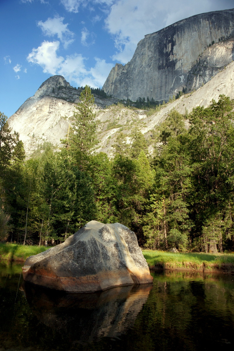 アメリカの国立公園ヨセミテのミラーレイクです。夏場は湖が干上がってしまうのであまり水がありませんが、水があるところを狙って岩と森が少し、水面に写っています。後ろに見える岩山と森と湖ハーモニー。