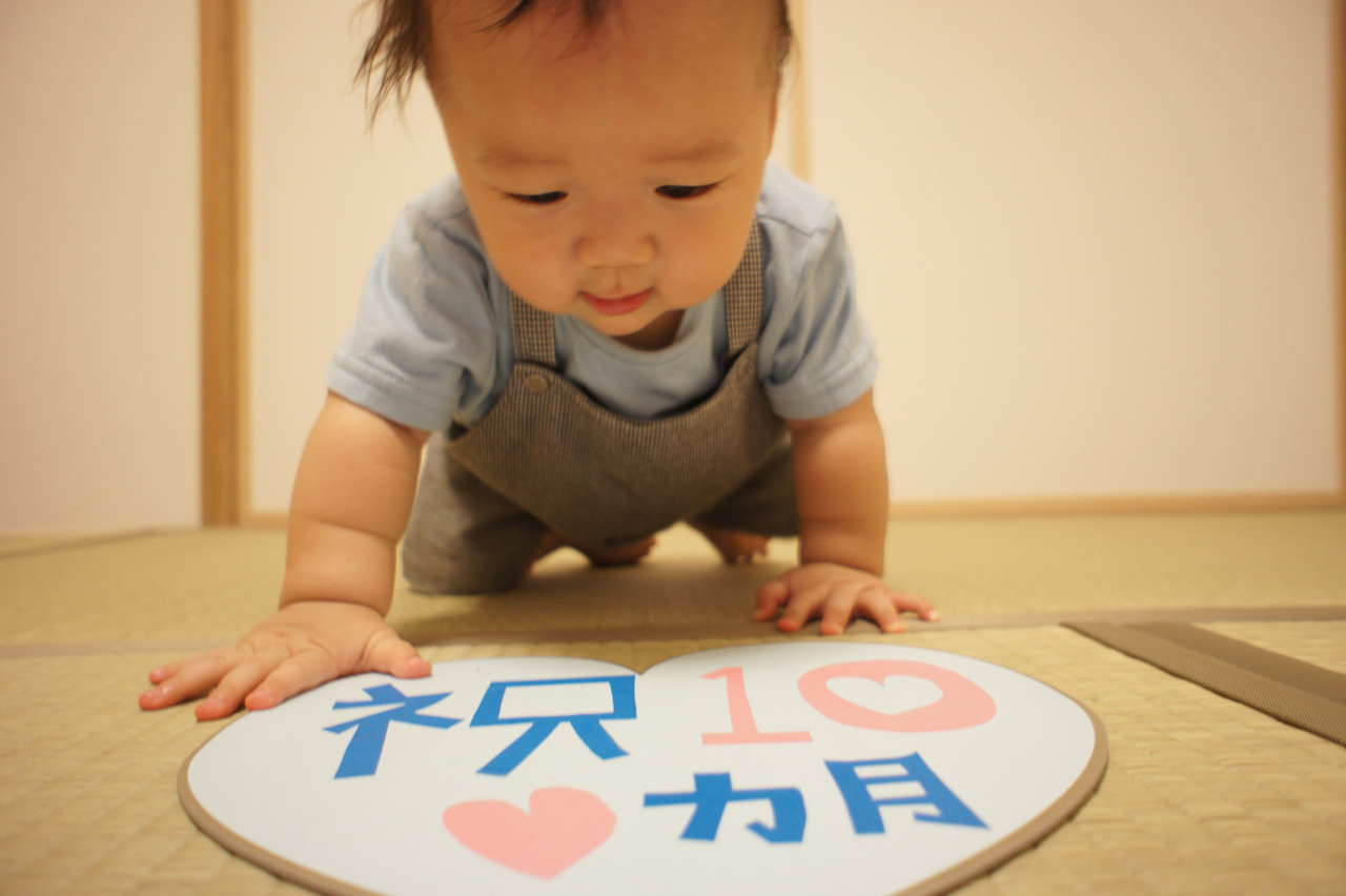 息子が本日で10カ月となりました。 記念に私が作ったプラカードとともにパチリ。 息子よ、大きくなったな(笑)