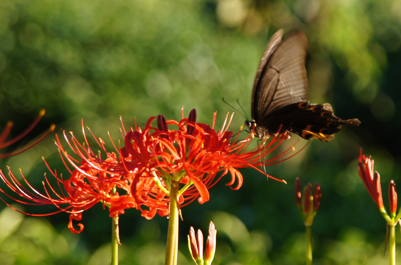 庭に在る彼岸花に黒あげはが丁度きましたので写しましたがなかなか思った向きに留まってくれません。