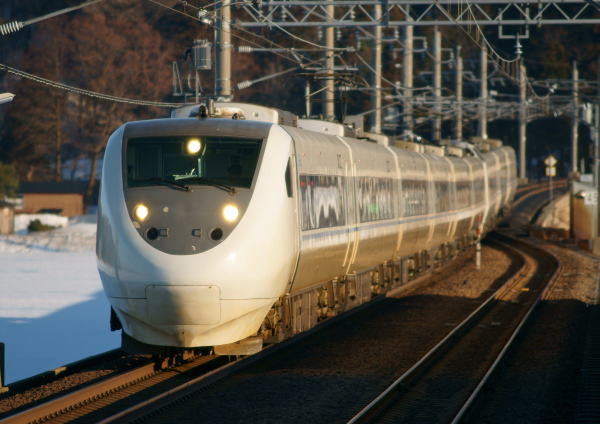 越後湯沢~金沢間の「特急はくたか」です。北越急行線内では在来線最速の160km/h運転をしています。 上越新幹線からの乗換え客を受け、首都圏と北陸を結ぶ重要な使命を負っています。 夕陽を浴びて金沢へ疾走です。