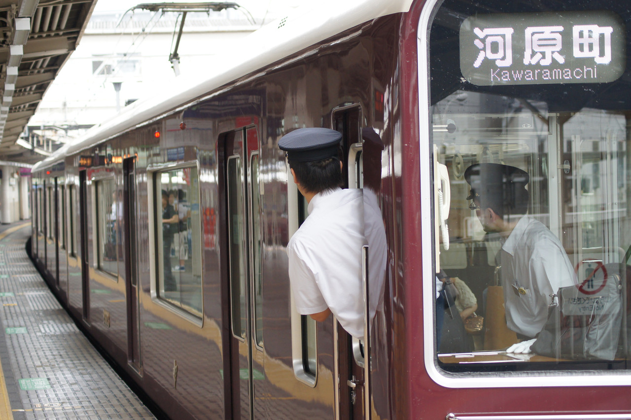 ドアを閉めて出発です。見習いの車掌さんのようでした。#阪急電鉄#