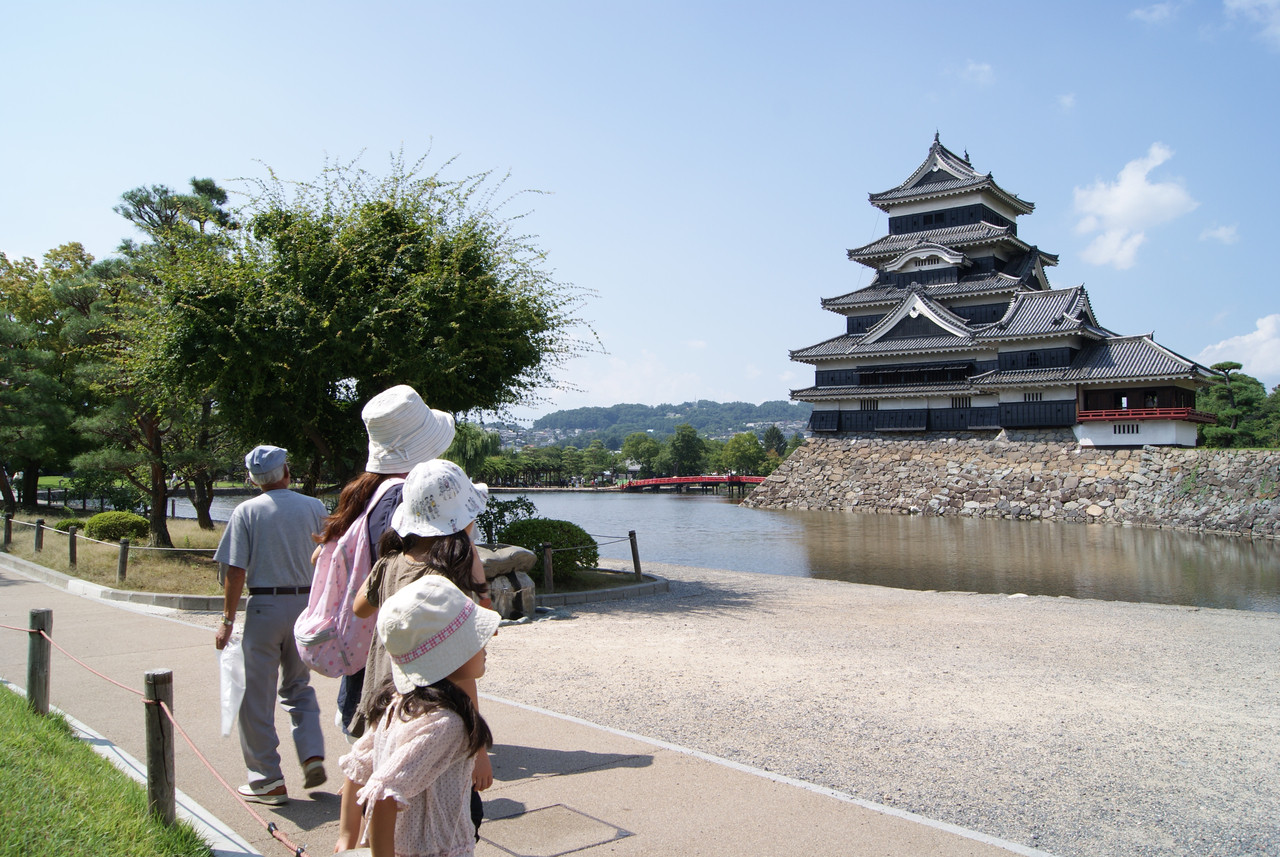 長野県の松本城です。 妻と娘二人、通りがかったおじいちゃんまで、 きれいなお城に見入っています。