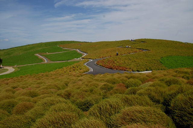 ひたち海浜公園のコキアの丘 まだ青いですが10月中旬には真っ赤になります。