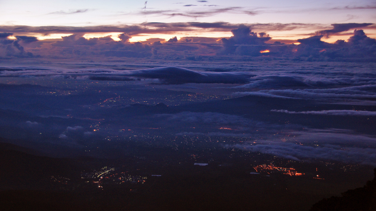 吉田口山頂から直下の須走 低気圧の明けた朝だったので、関東平野に低い雲が垂れる 太平洋の沖合には依然高い雲が残るが、いたって平穏で 天候の好転を予感させるような朝霞