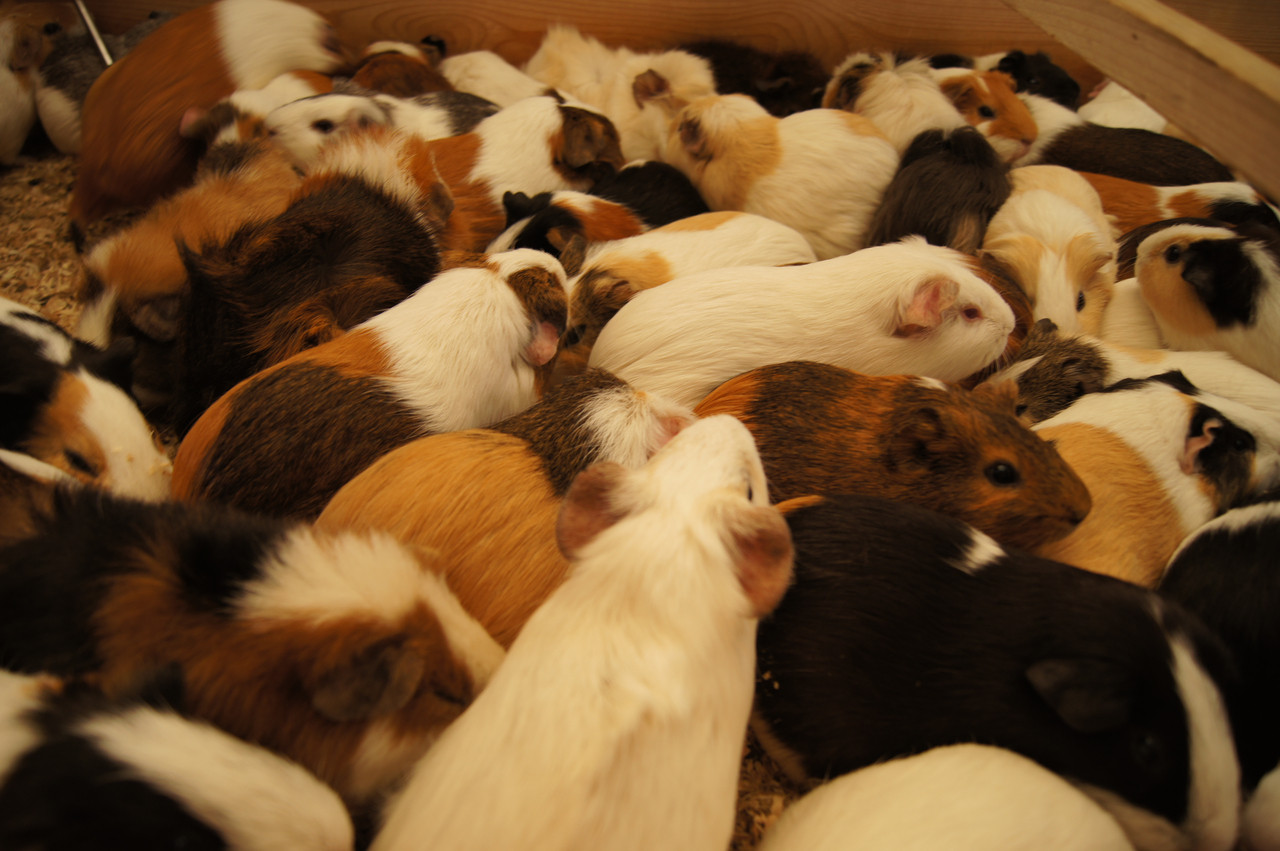 井の頭自然文化園、モルモット体験コーナーにて。人が手を差し入れると、逃げようとして一斉に移動が始まります。