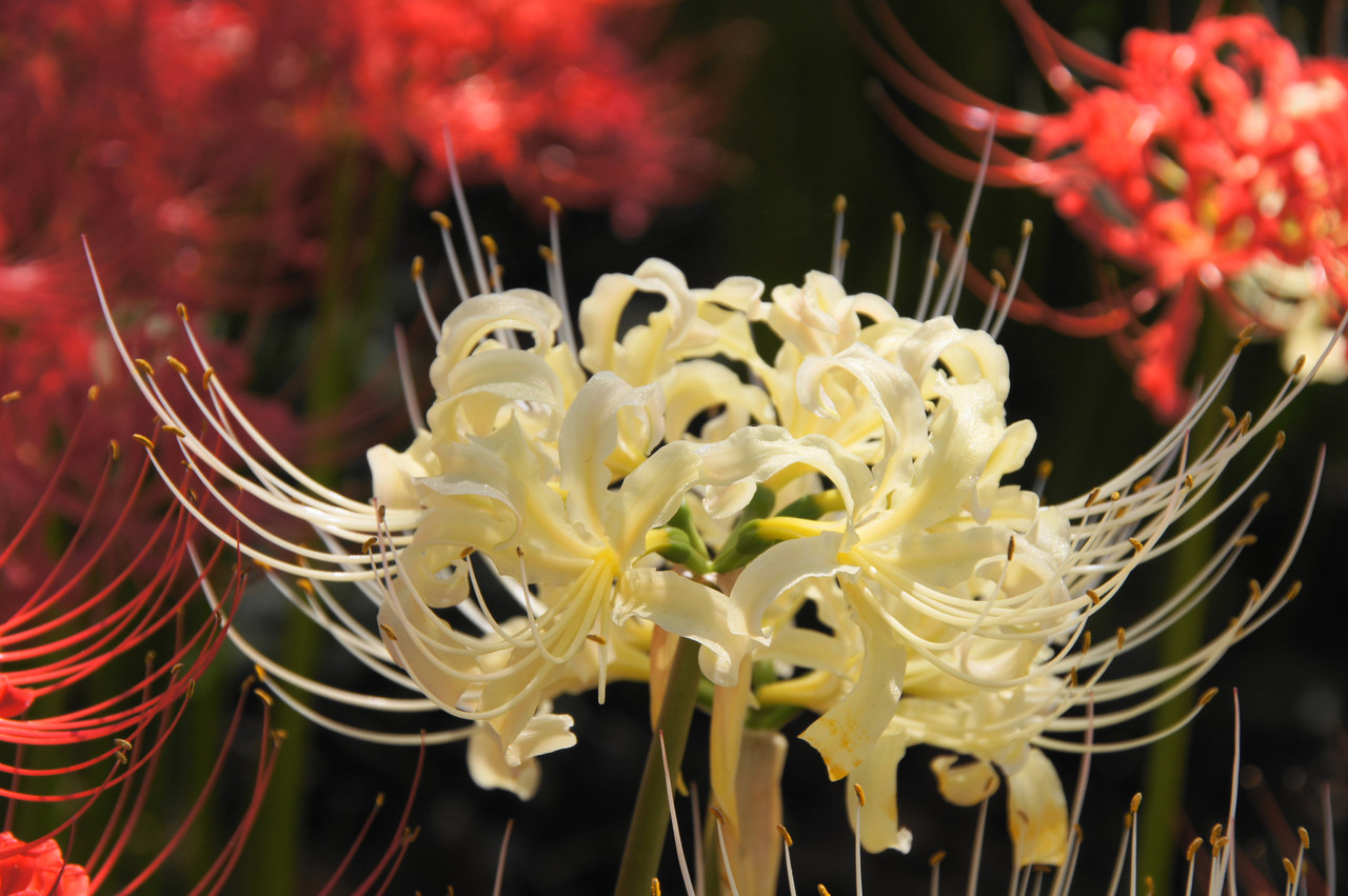 晴れて風の強い日、やはり太陽に映えて色鮮やかでした。揺れる花を風の収まる一瞬待ってシャッターを押しました。