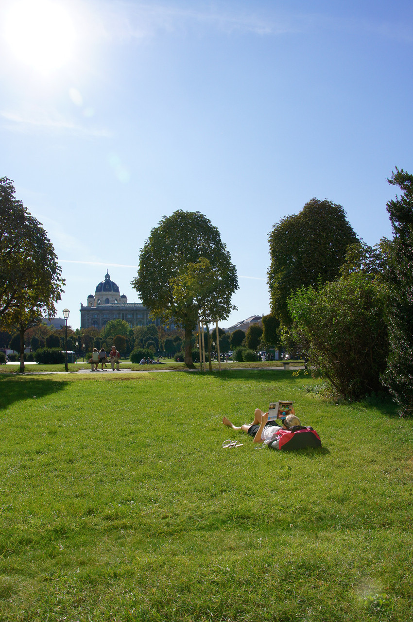 秋なのに日中は暑い、そんなある日。 ここはオーストリア、ウィーンのマリアテレジア広場。 草むらでのんびり。 すてきなかんじ♪