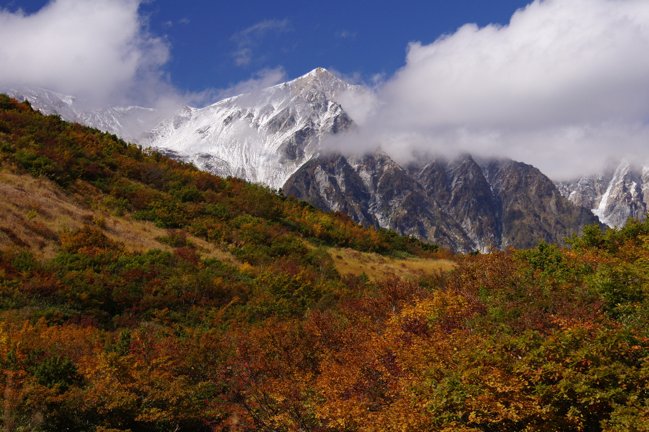 八方尾根散策途中の紅葉と後方の山は初冠雪の白馬岳(しろうまだけ 2932m)