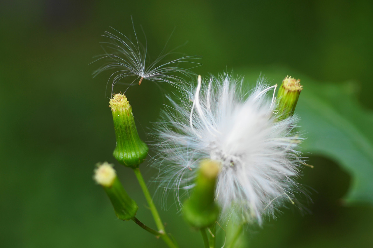 雑草の生い茂った土手から飛び立つ寸前の綿毛です。