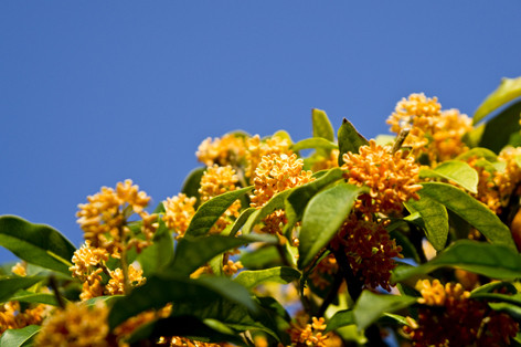 良く晴れた秋の朝の通勤路。 金木犀がところどころで良い香りを発散しています。
