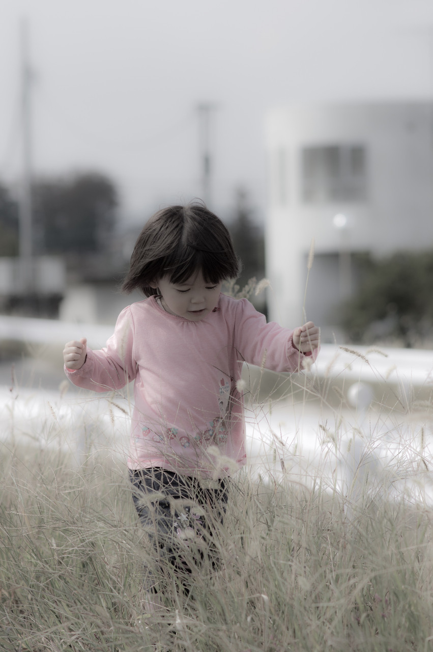 散歩の途中。今日はポーズをとる前に自然な姿の娘を。草むらの中とか好きなんですよね^^彩度下げてみました。
