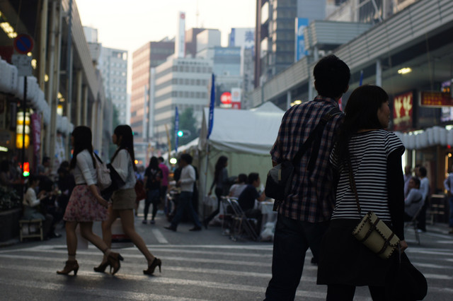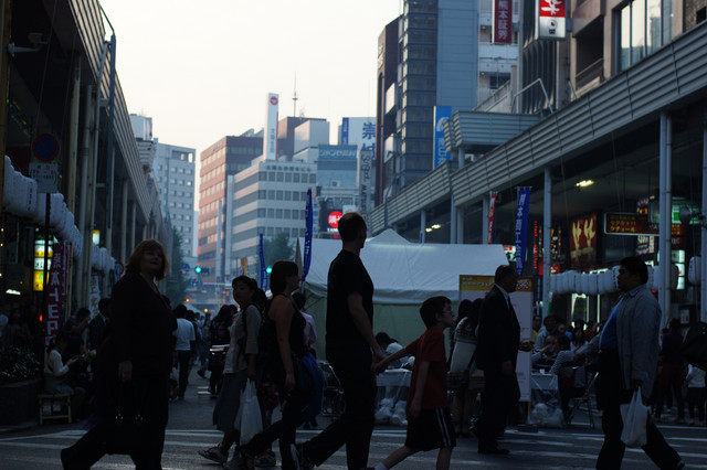 熊本の祭りで車道が歩行者天国になっていました。 あまり見ない光景に通行者も気になるようです。 jpeg撮って出しです。 あ、2枚目は少しトリミングしています。 NFDレンズのせいでしょうかExifが出ないですね。