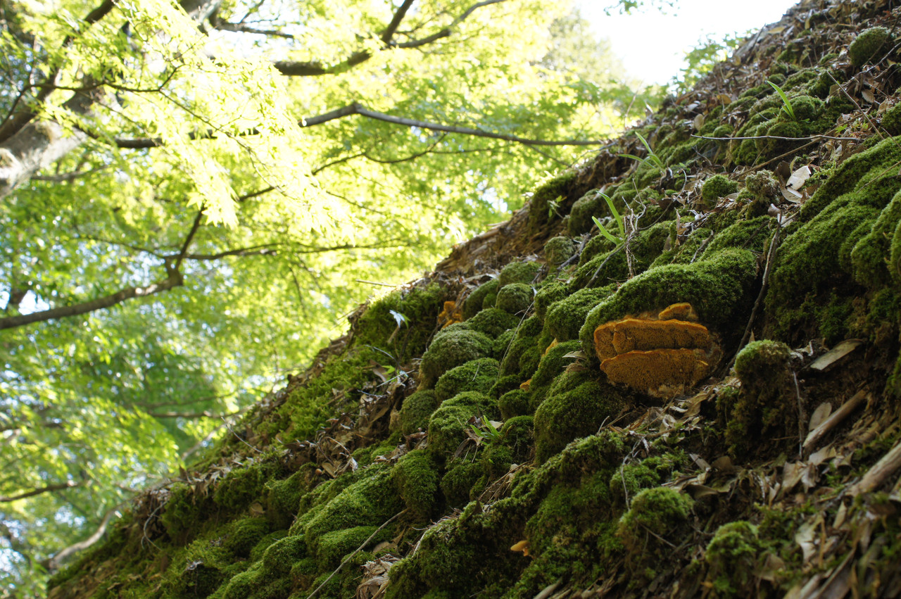 縄文風の屋根に苔がいっぱい生えており緑一色