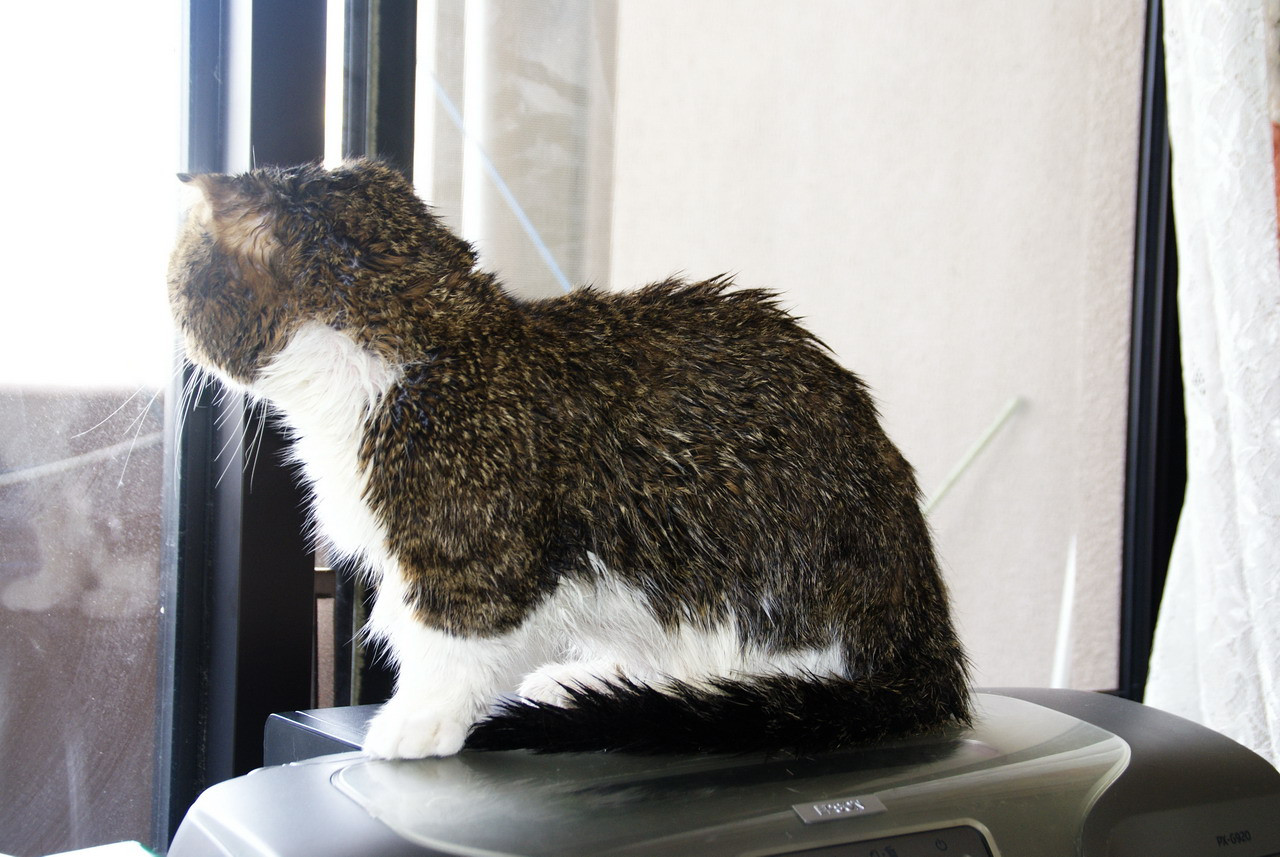 毛繕いの途中でひと休み?外を眺めているマカロンちゃん