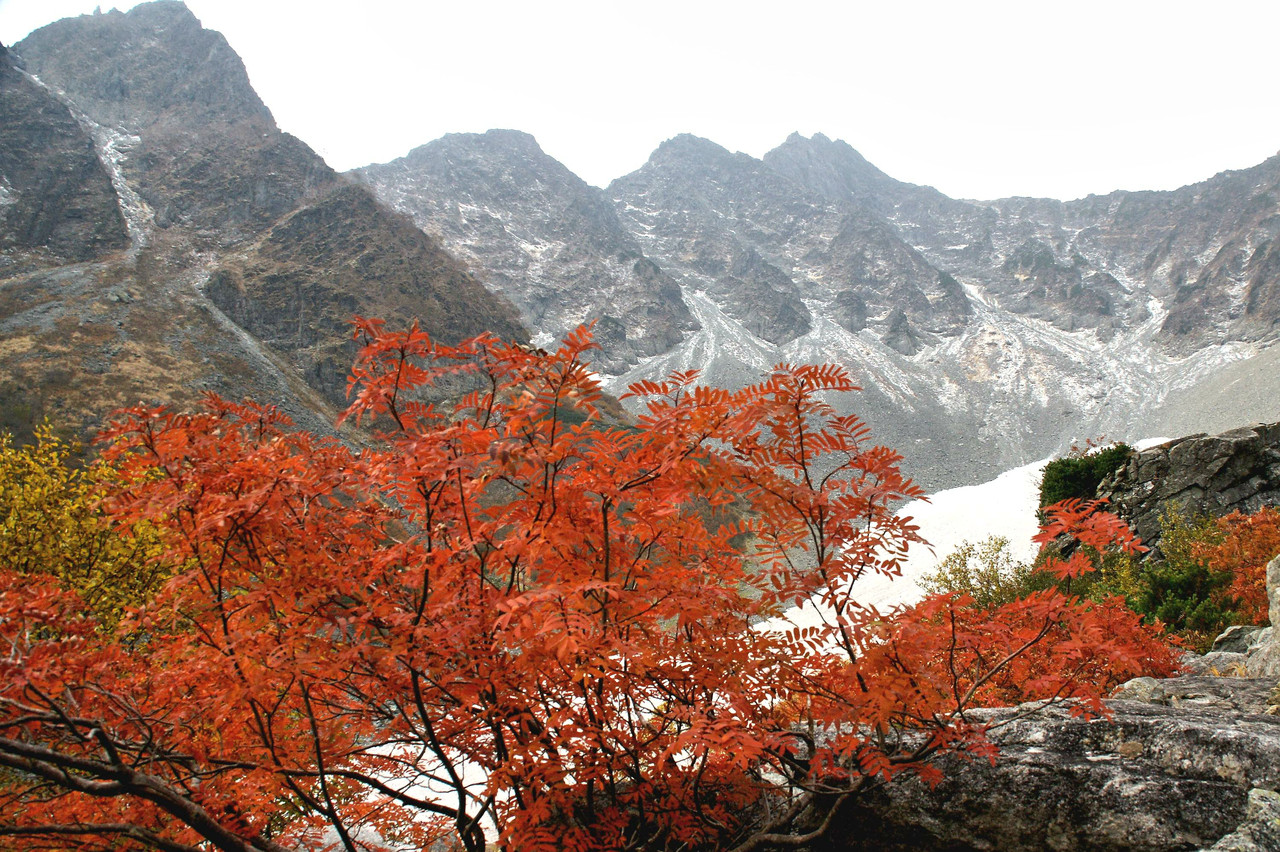 涸沢に雪渓をせに深紅に色ずくナナカマド