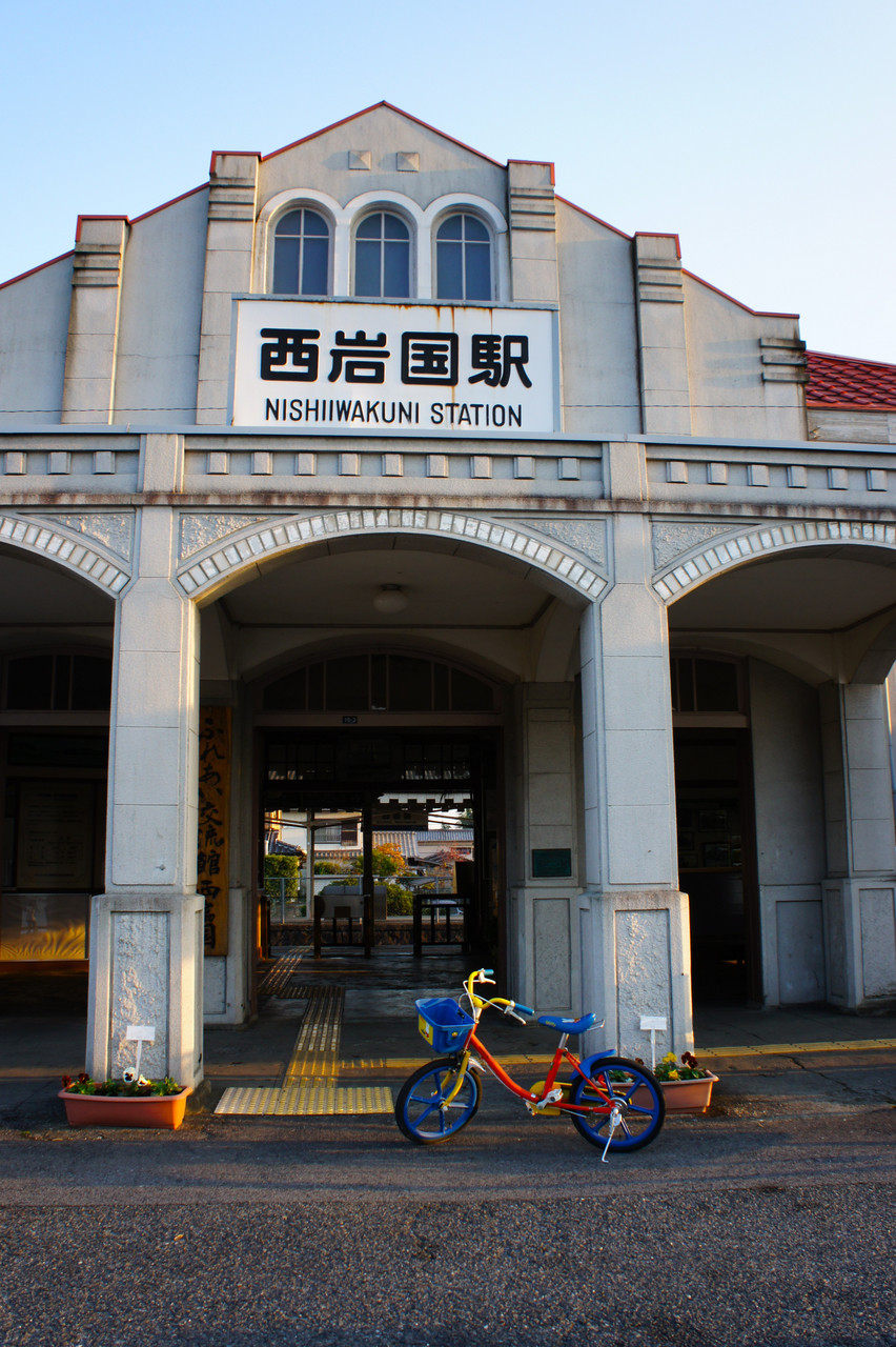 ちょっとレトロな駅舎の前に、可愛い自転車が1台。