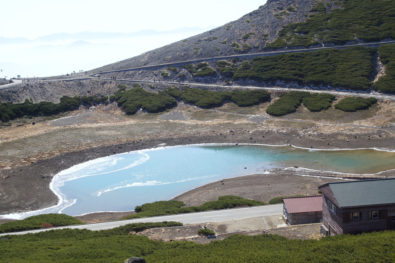 天気晴れ、気温-4℃です。乗鞍鶴ケ池の表面は氷始めているようです。後方、遠方に笠ケ岳、槍ケ岳、奥穂高、前穂高、常念山脈などの山々が見えています。