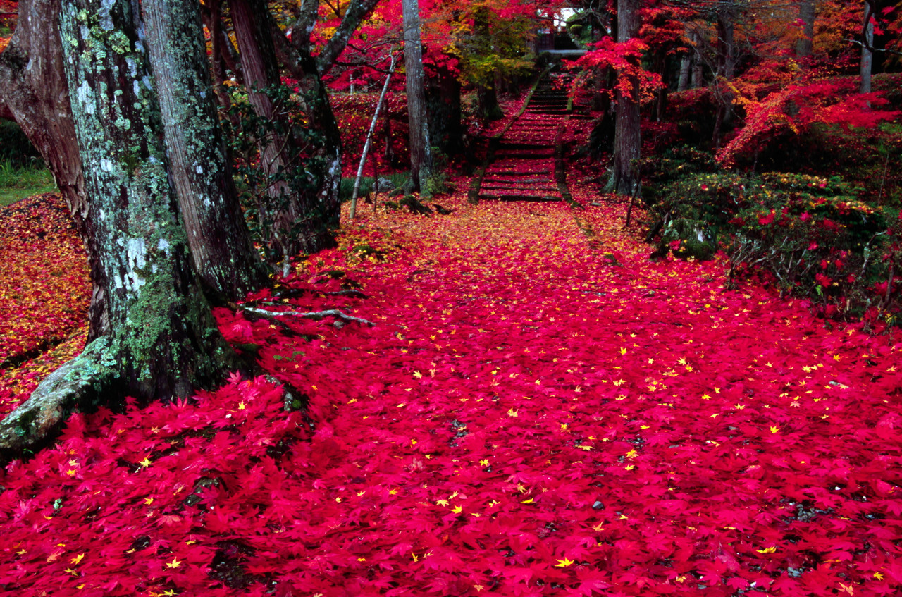 京都・園部「龍穏寺」の参道に、紅葉の落ち葉が赤いじゅうたんが敷き詰められたようになっていた。