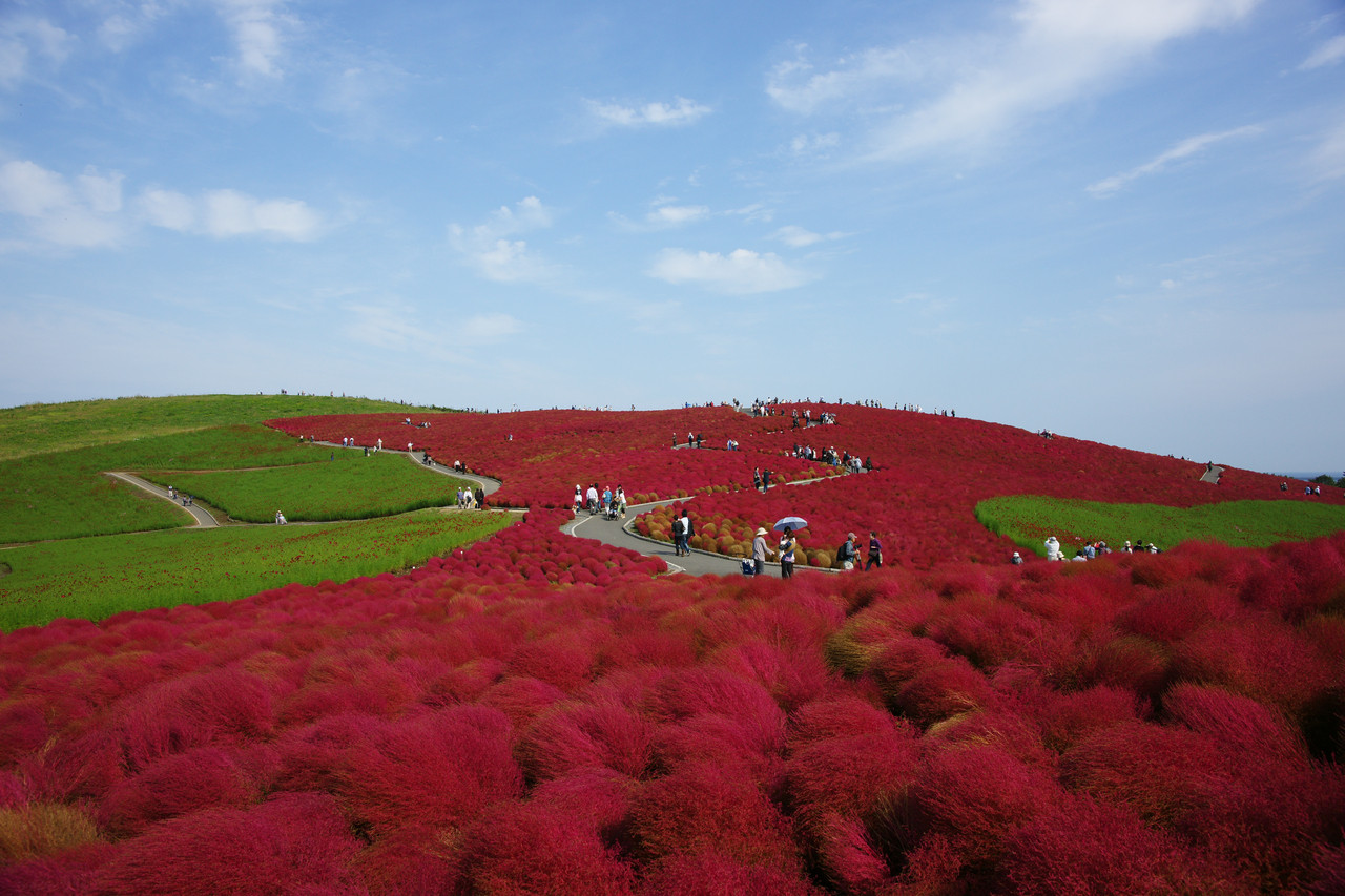 ひたち海浜公園のコキアの紅葉です。この丘はゴールデンウイークには青く染まります♪