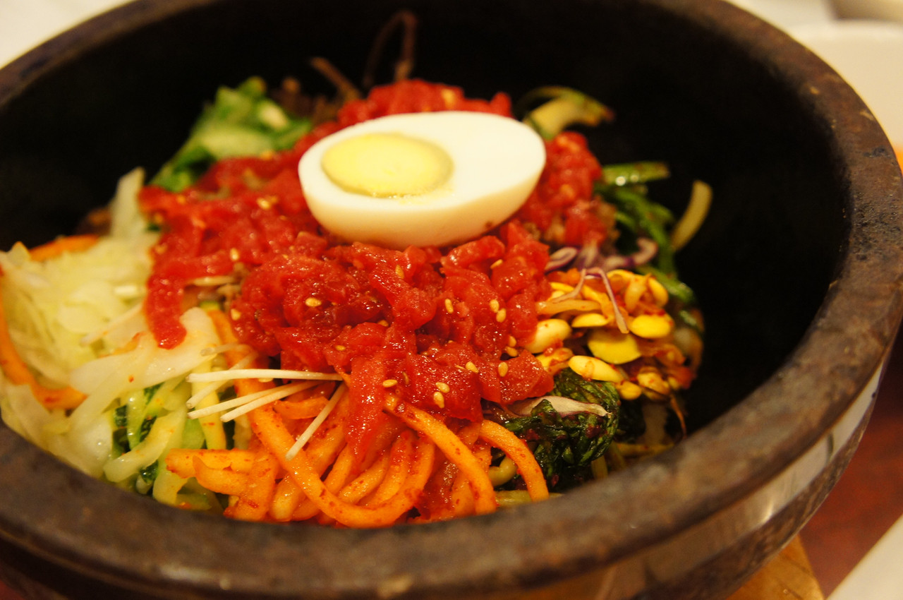 最近では、ユッケビビンバを頼むと 「日本の方には焼いてお出ししますね」と 気遣いをしてくれるお店が増えてきたように思います。 ユッケの色が綺麗でした。 石焼き釜で焼いていただきました。