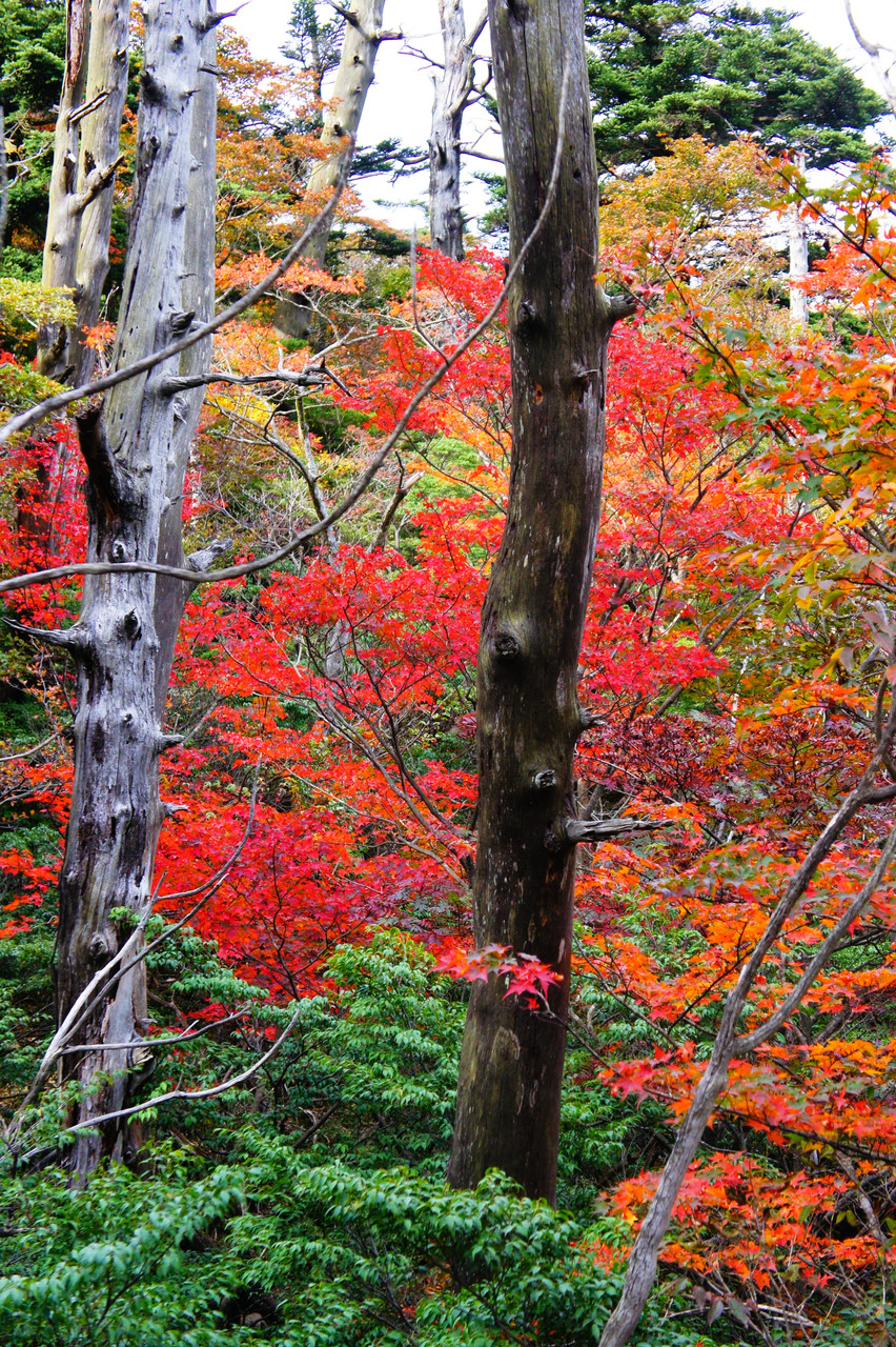 赤く色づいた紅葉と立ったまま朽ちてしまったような大木が対照的でした。
