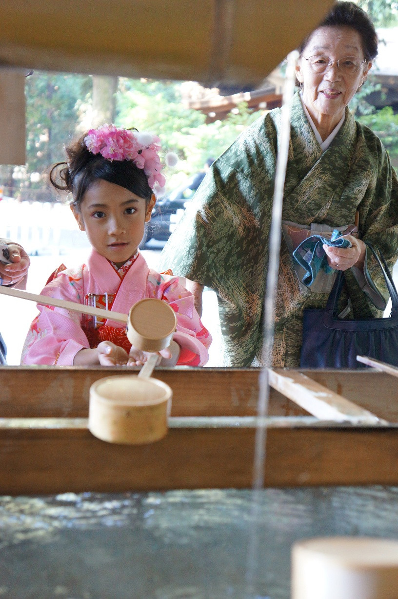 今日は七五三に行きました。 ひいおばあちゃんと一緒に着物。 今日はちょっとおすましさん。