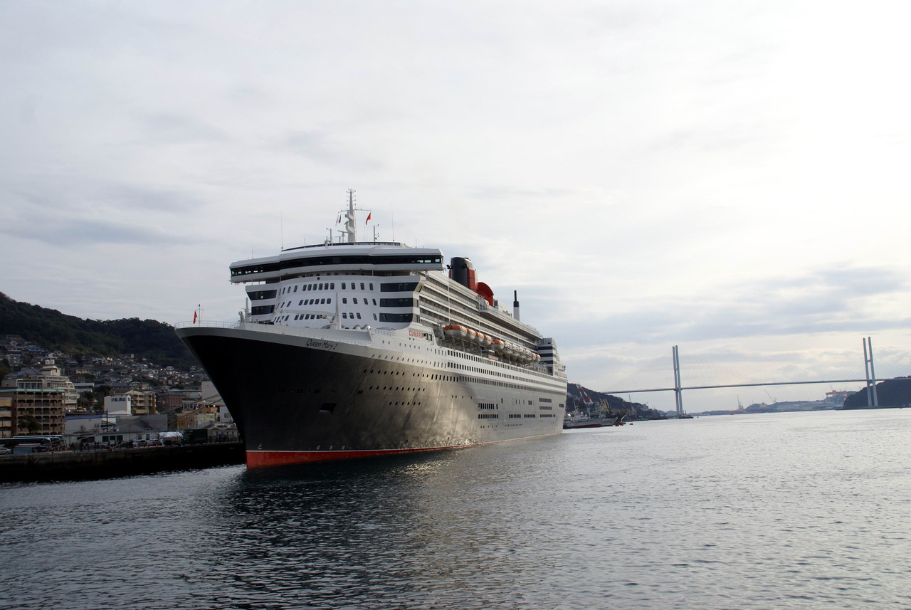 長崎に入港したQueenMary 2 です。右に見える橋が女神大橋(ビーナスウィング)です。
