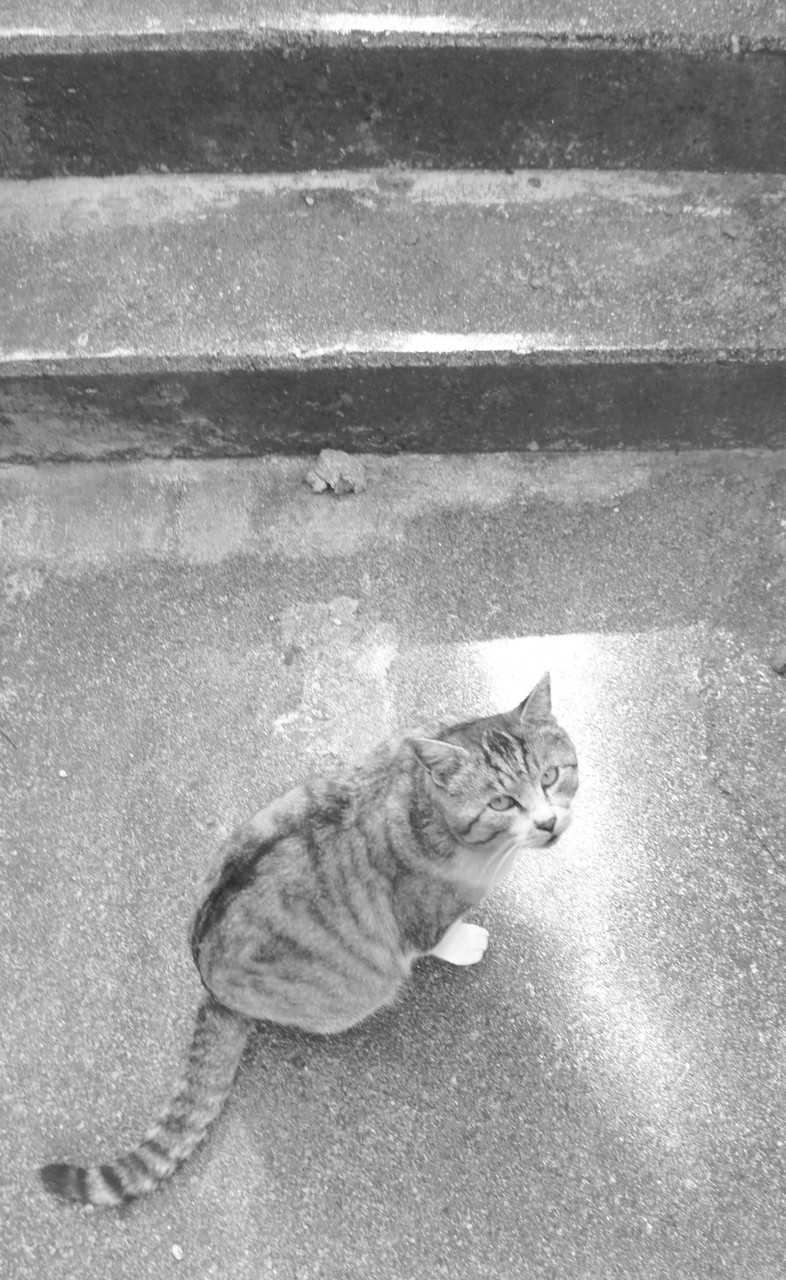 下諏訪町、町あるき中のヒトコマです。 上から猫を撮影したらふと見上げてくれたので、慌てて取りました。
