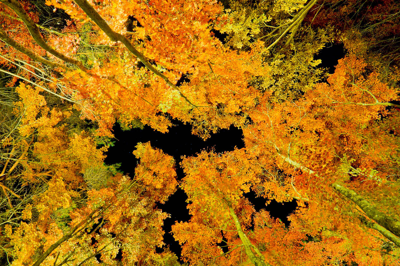 紅葉のライトアップを上向きに撮影してみました。 明るさなどはRAW現像時に調整してます。