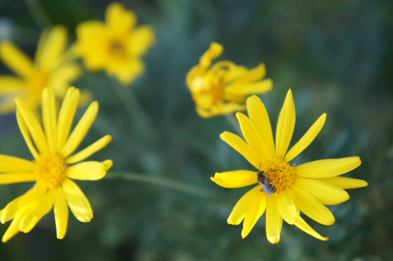 撮れた黄色い花の写真を見るとミツバチがいたことにびっくり! ミツバチってこんなに小さかったんですね!