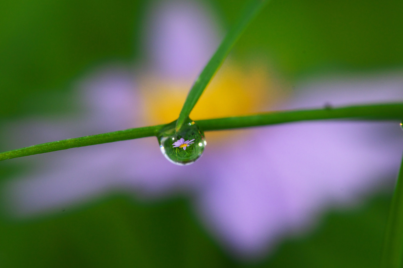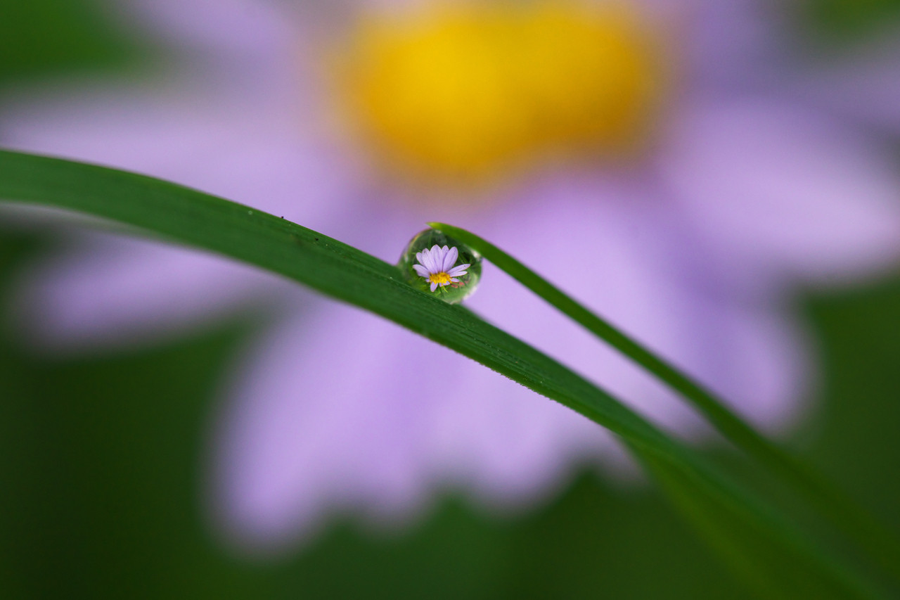 朝露が付く野に野菊が咲いています。露には小さな野菊が映り、はかなくも花が咲いているようです。