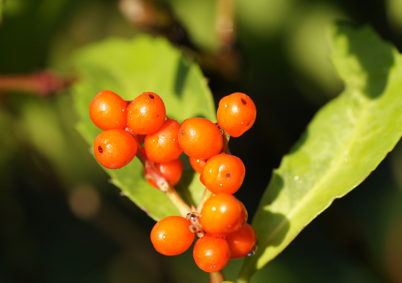 千両がようやく赤く色づきました。鳥に啄まれないうちに写真にしました。