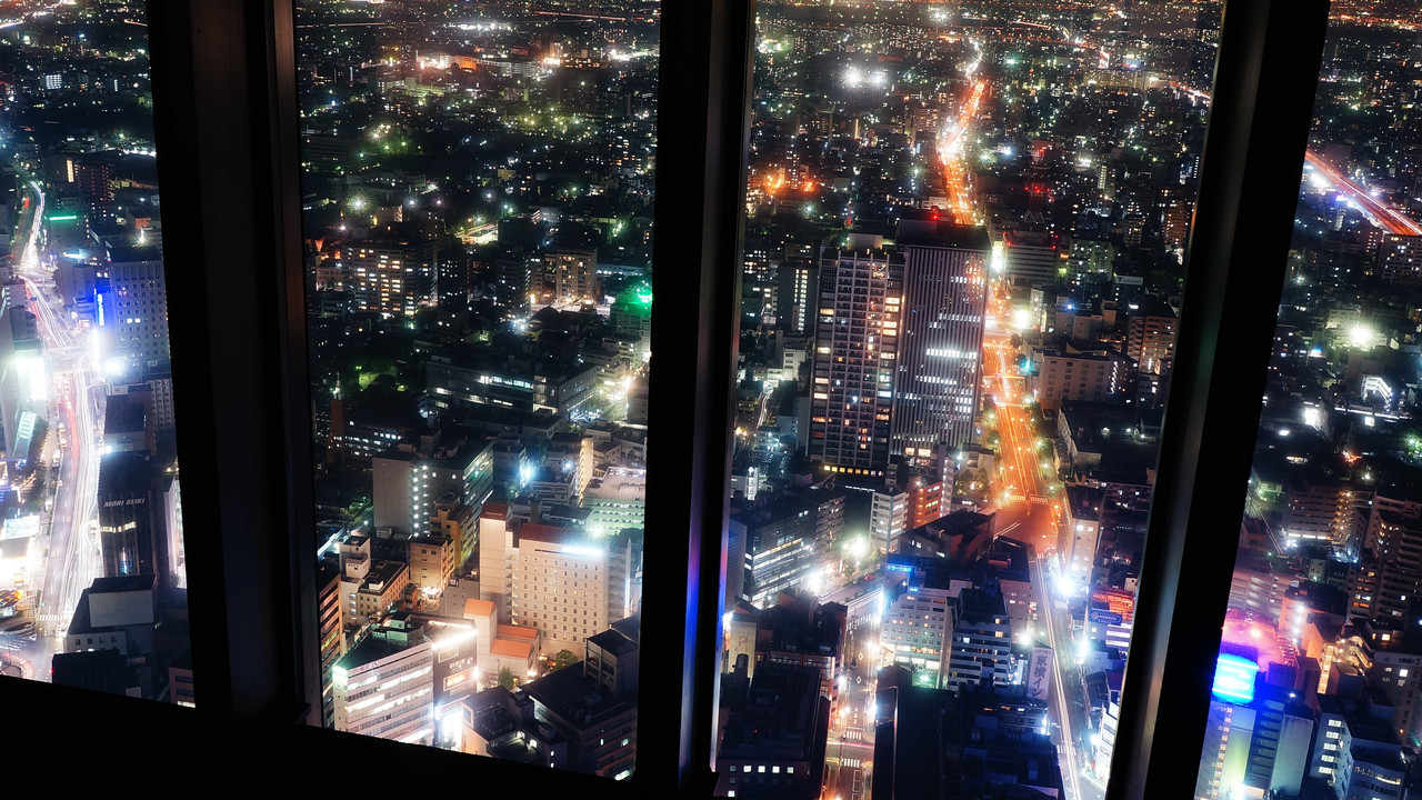 窓越しから見る街。 川のように流れる道。 夜の幻想。