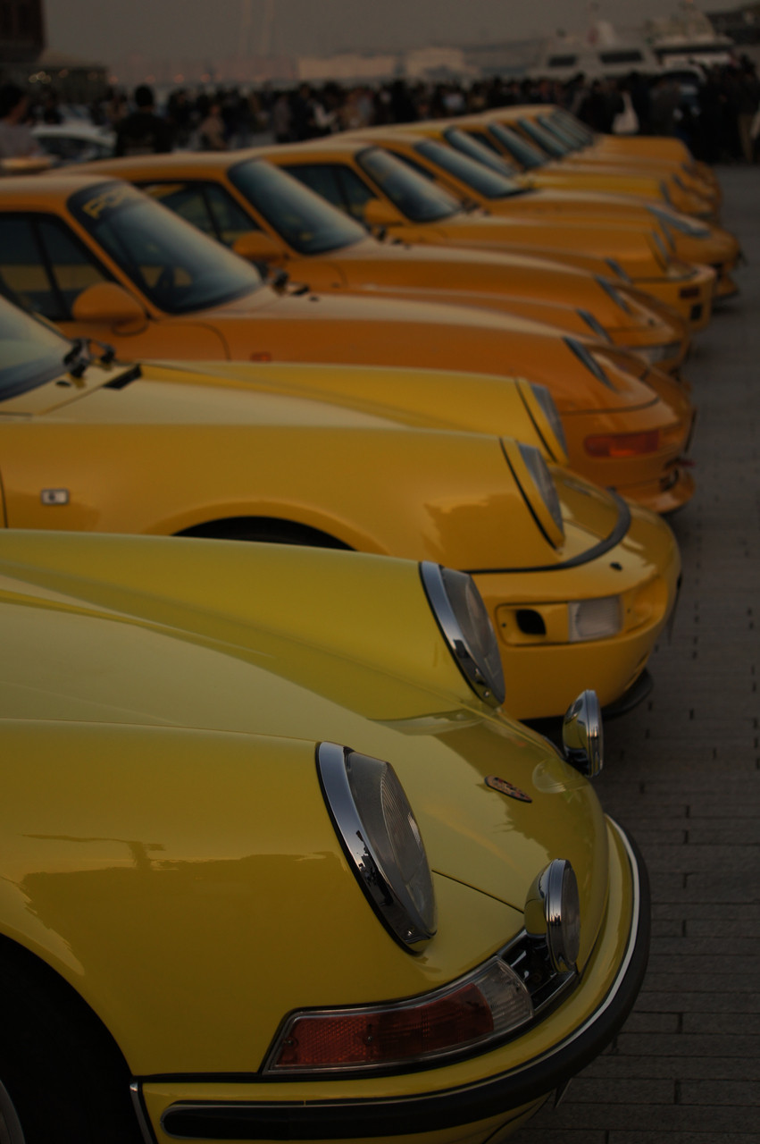 横浜の赤レンガ倉庫に行ってみたら、すごい数のポルシェが止まっていました。黄色のグラデーションがきれいだったのでパチリ。