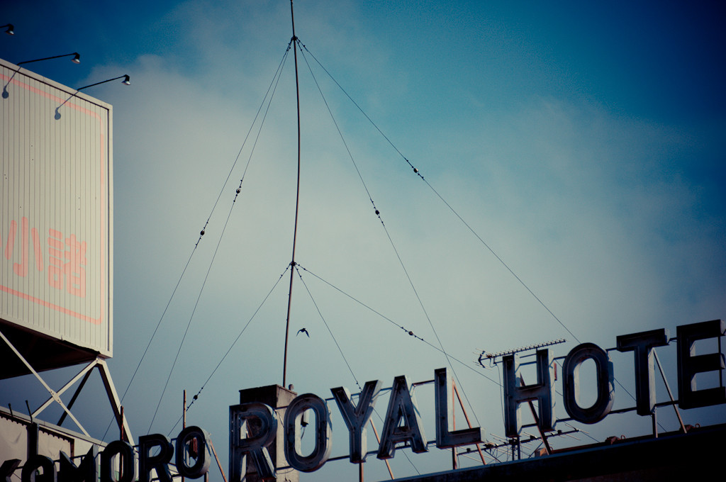 飛び去る鳩とホテルです。