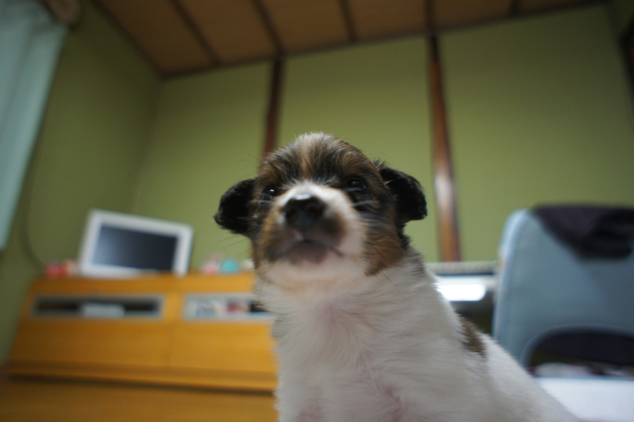 夏に生まれたパピヨンで、もう違う主人のもとで飼われているのですが、私の惜別の思いを知るわけもなく私を見つめている時の1枚です。 元気に大きくなっているかな~