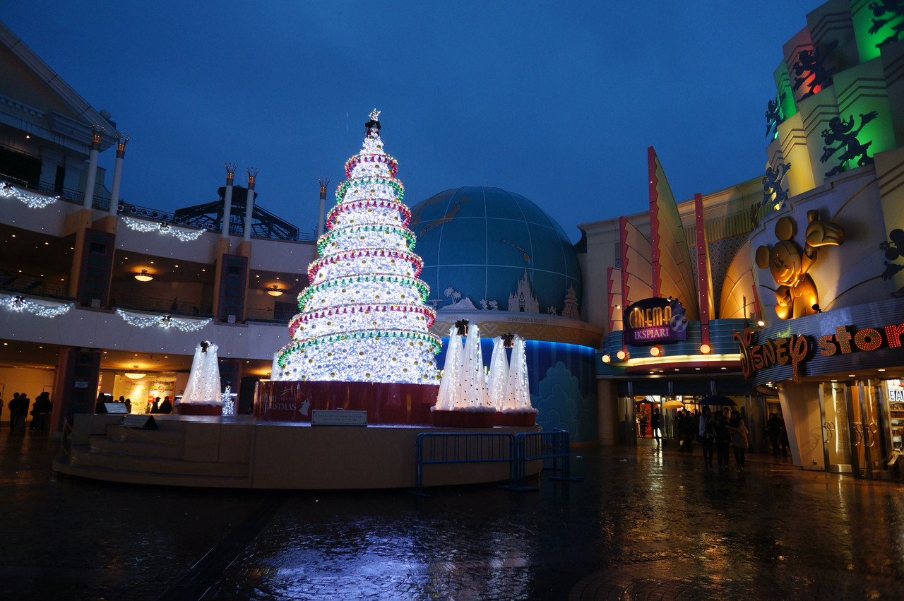 雨の降る夕方のイクスピアリのクリスマスイルミネーションです。 照明が濡れた路面に写り込みキレイでした。