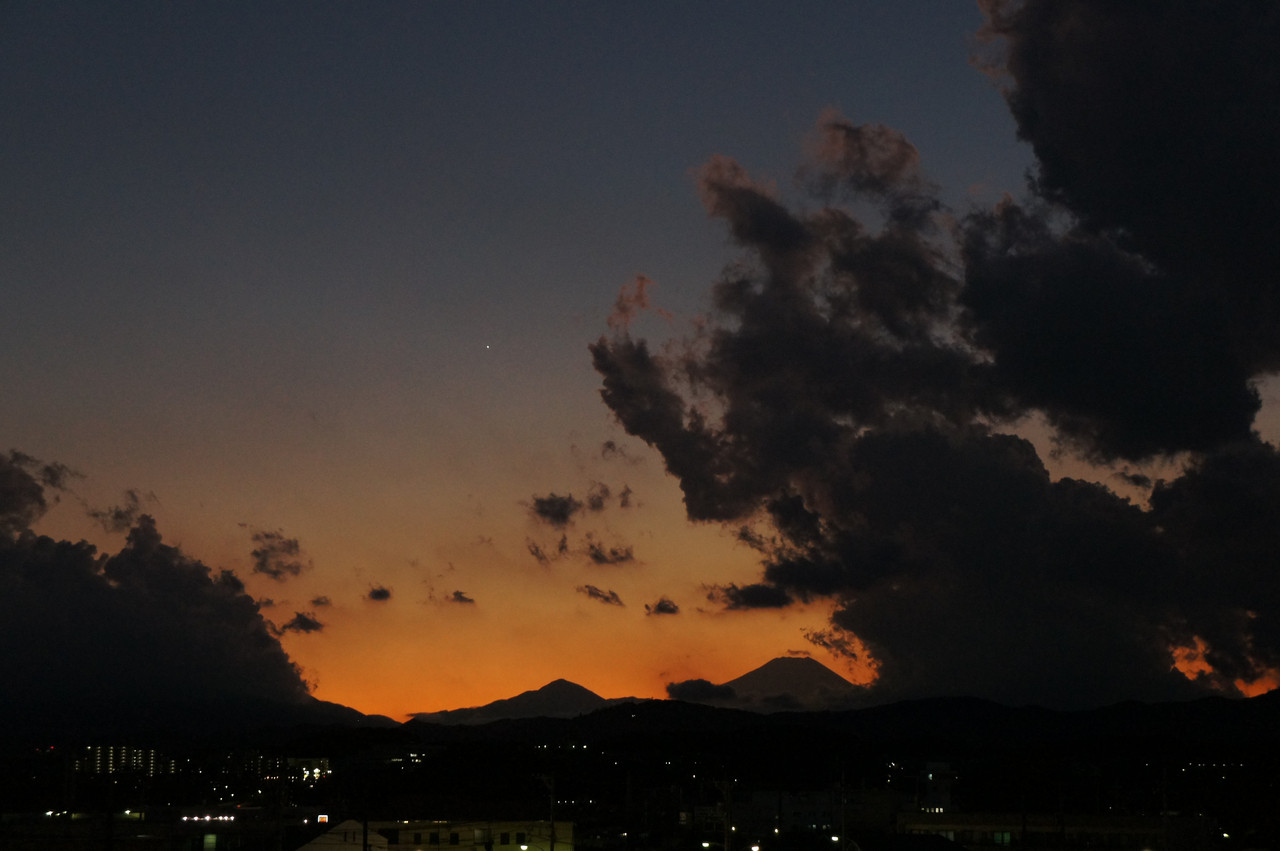 急激に広がる真っ黒な雲の切れ間から、富士山のシルエットと金星が現れたところを撮れました。