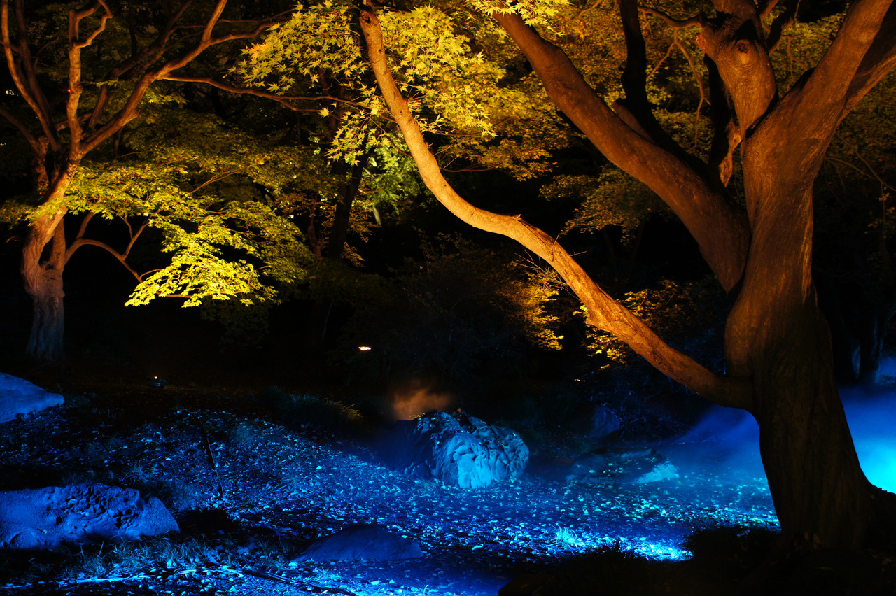 六義園のライトアップでの1枚です。 地面近くのライトと木々を照らすライトのコントラストが、幻想的な空間を作り出していてとても奇麗でした。