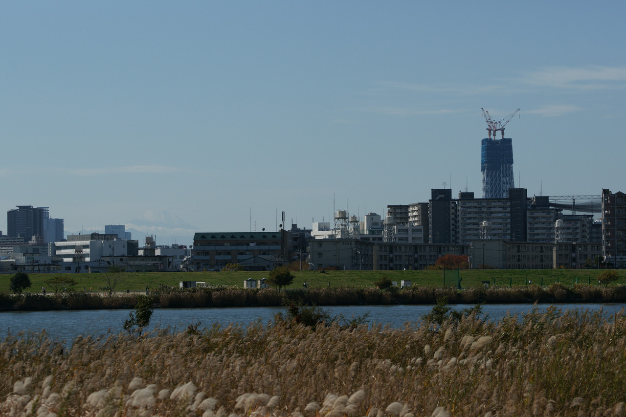 荒川土手から、左側にうっすらと富士山が見えます。