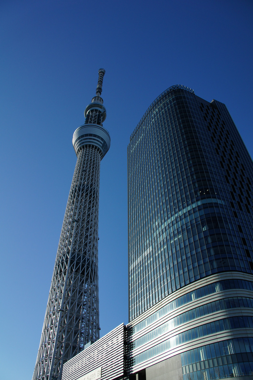 東京スカイツリー近くにて 何でも、見る方向によっては傾いて見えるそうです。