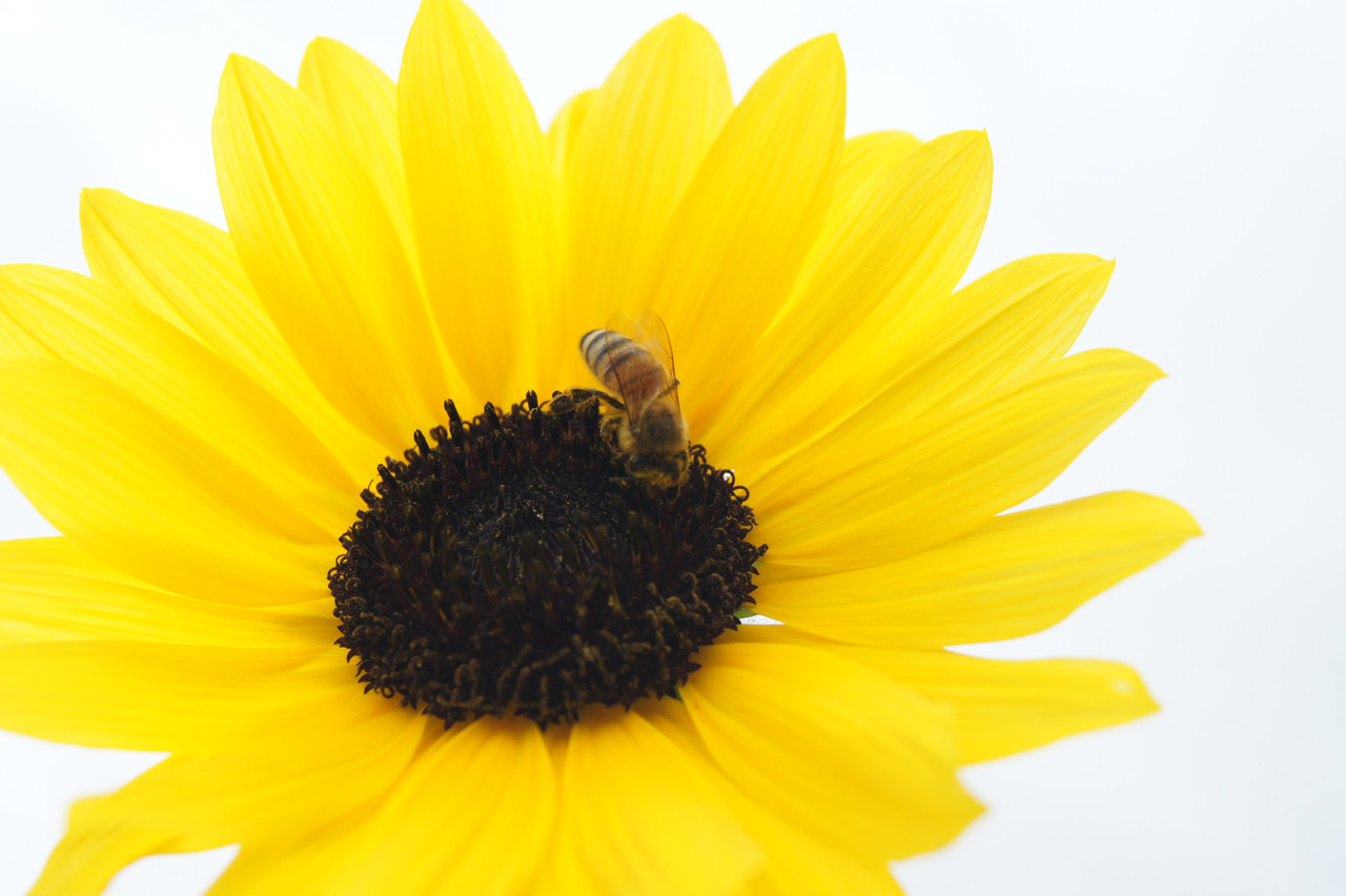 曇天で少し涼しくなりつつある日のこと、ゲリラ的に生えている小さなひまわりを見つけました。ミツバチも秋の訪れを感じているのでしょうか?一生懸命ミツを集めて跳んでいました。