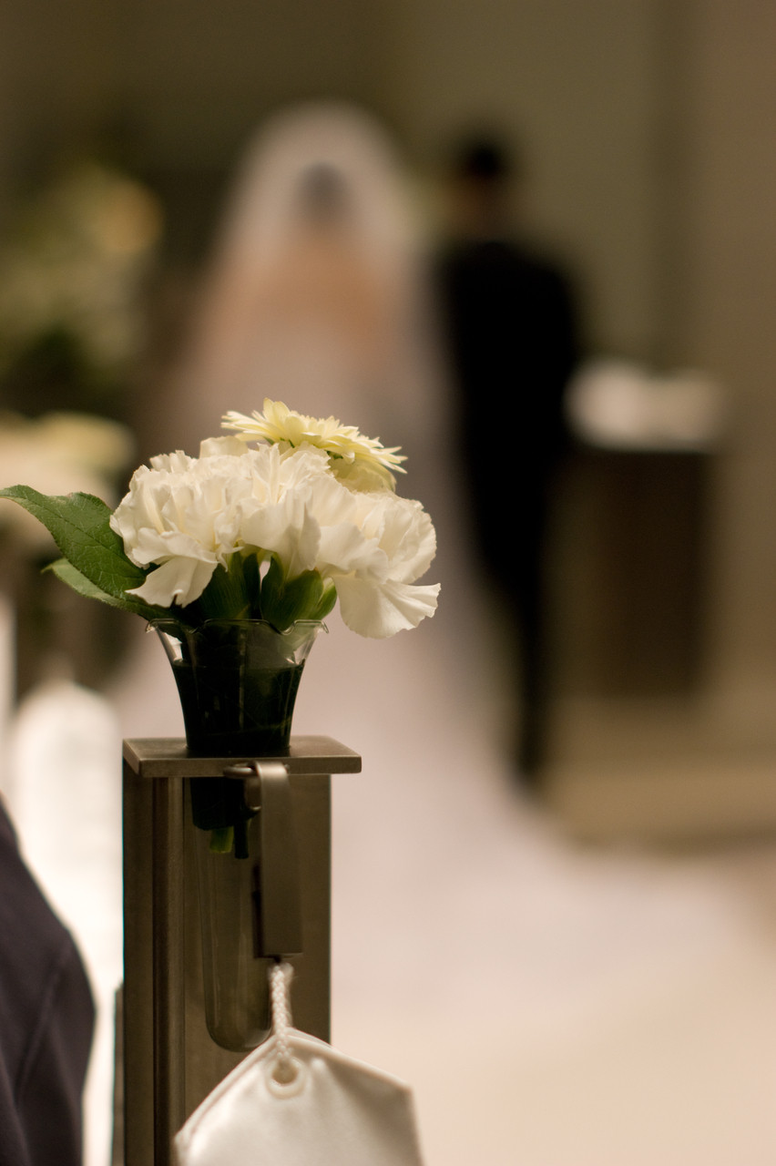 バージンロードを飾る白い花。 普通に新郎新婦を写してもおもしろくなかったので花を写してみました。