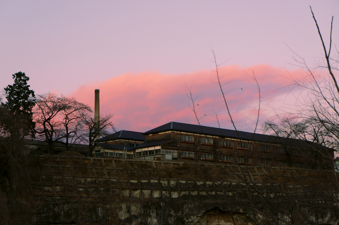 誰もが社会科で習ったであろう旧官営富岡製糸場を 観光客は見ることはないと思われる裏側から撮影 実は大きな川のほとりの崖の上に建っているのでした。 夕陽を浴びた雲が綺麗でした。
