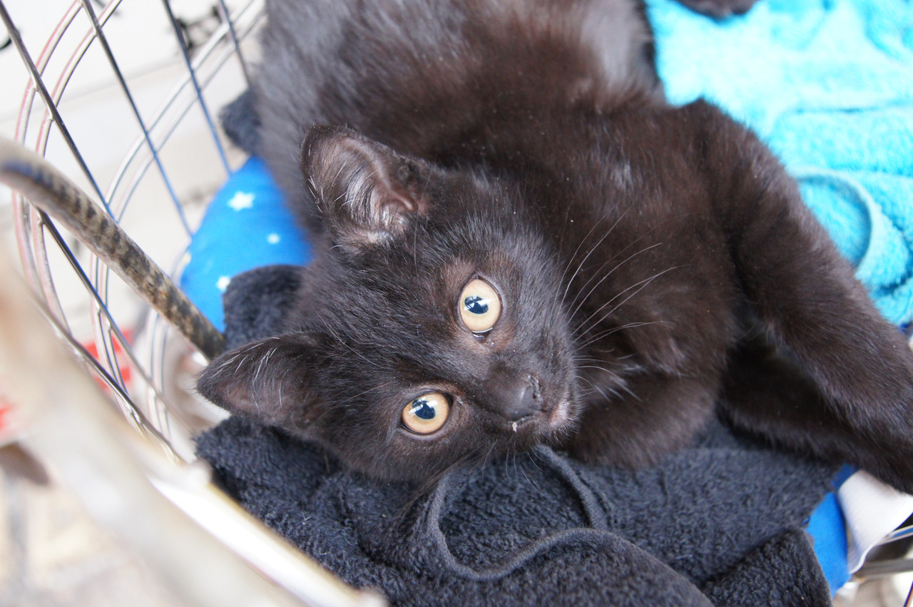 自転車のカゴの中でくつろいでた子猫です。 野良猫っぽかったですがすごく人なつっこかったです。