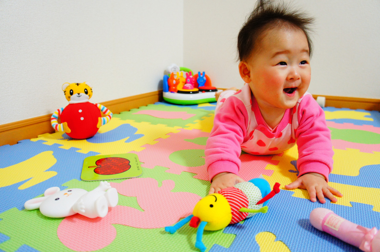 我が家にプレイルームができあがりました。 寝返りにずりばり、床も叩き放題! とっても楽しそ~(^^)