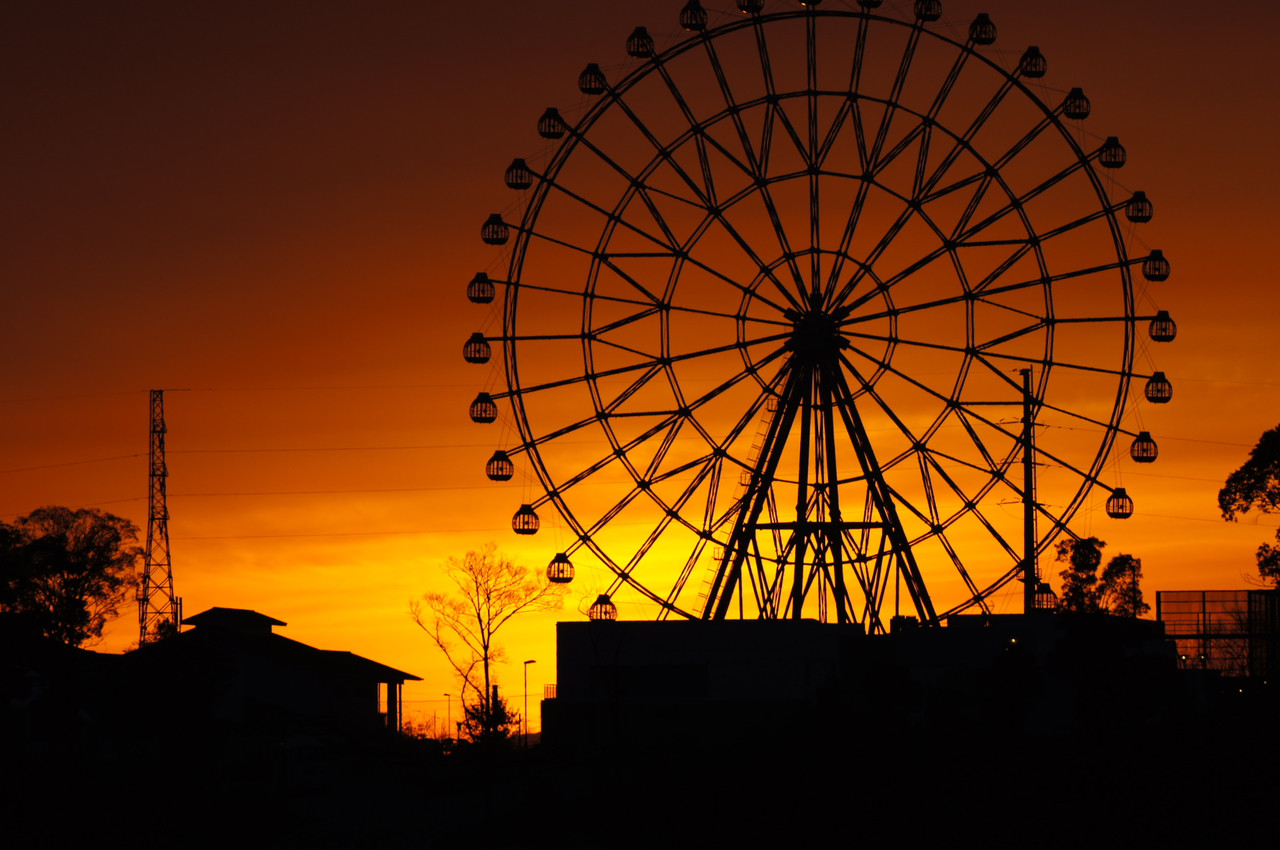 朝日に浮かび上がった観覧車を望遠で捉えてみました。