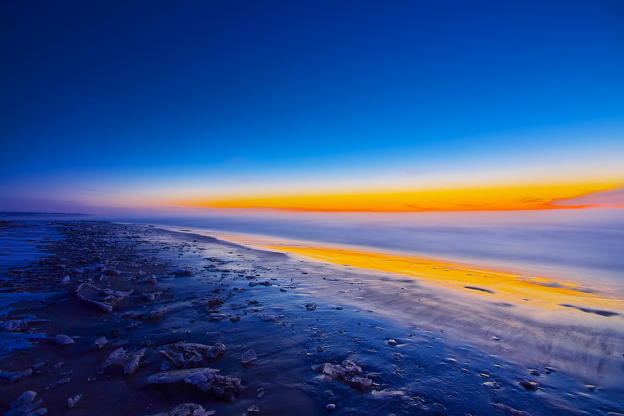 十勝川河口の波打ち際にて 2012年元旦 気嵐煙る水平線を朝焼けが紅く染め、その朝焼けが波打ち際を紅く染めていました。 荒涼とした最果ての浜辺も新しい年が訪れます。^^;
