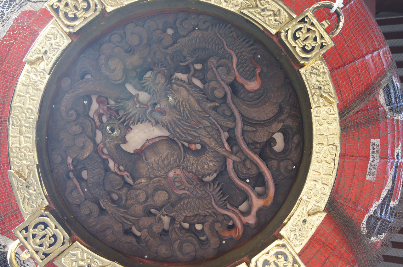 提灯の底には今年の干支の竜の彫り物があります、 持っている球の色が提灯によって違っています。