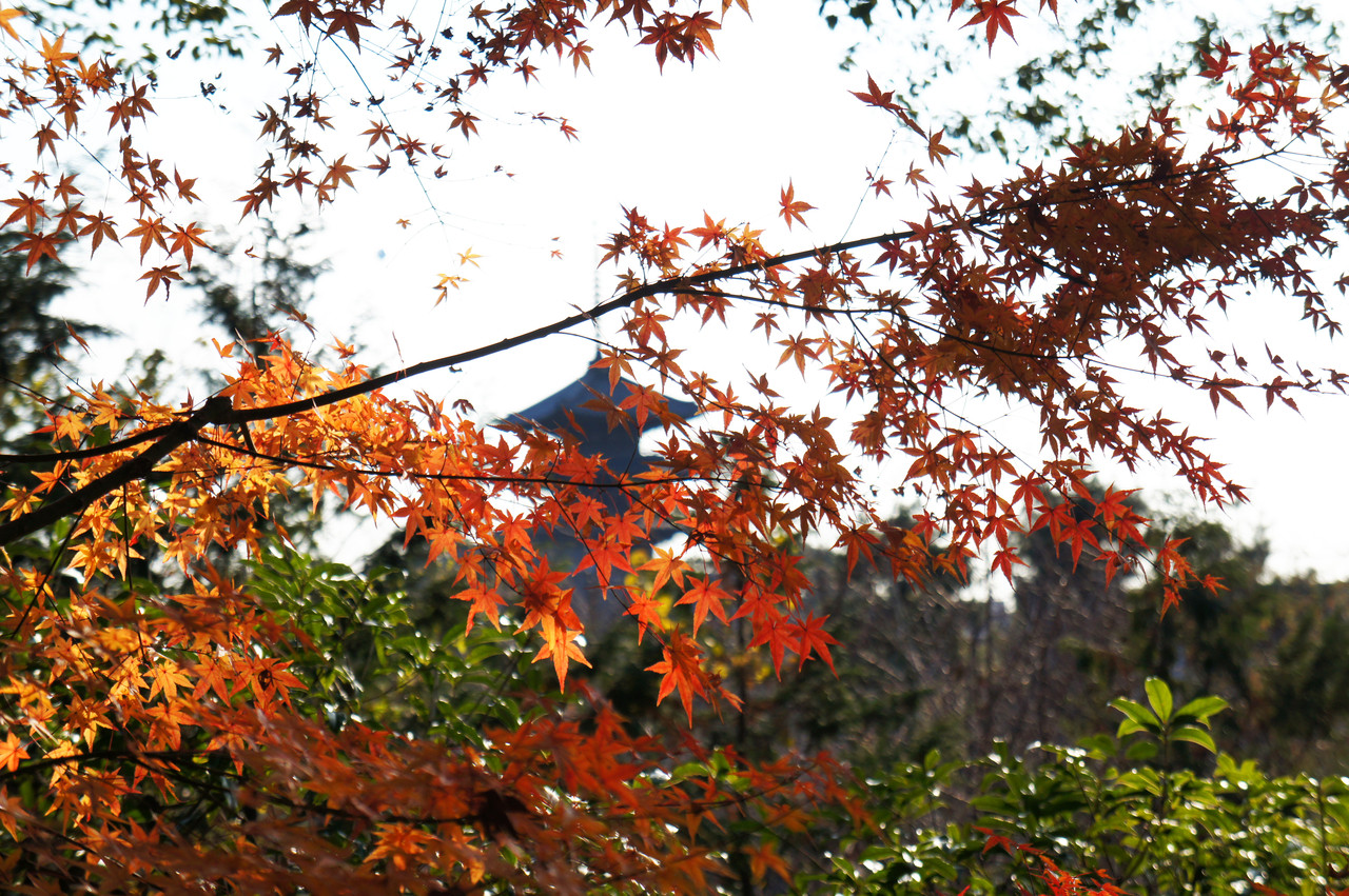 昨年は気候が不順だったせいか、まだ落ちないで残っている紅葉もありました。 まるで秋の写真のようですがお正月です! こちらは高台寺の参道から撮った一枚。 八坂の塔が見えていました。